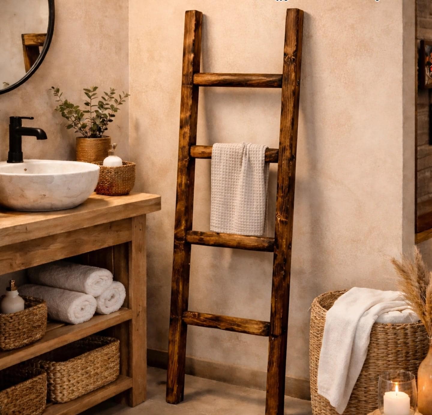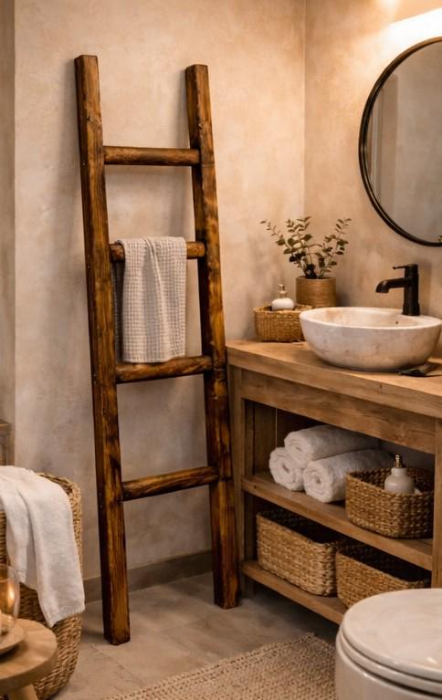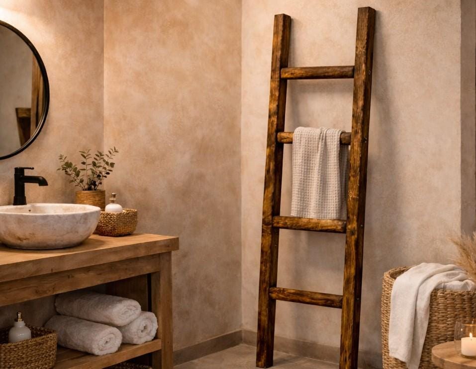 Made from solid wood and finished by hand, each ladder combines rustic charm with practical storage — perfect for bathrooms, bedrooms, or cosy living spaces.