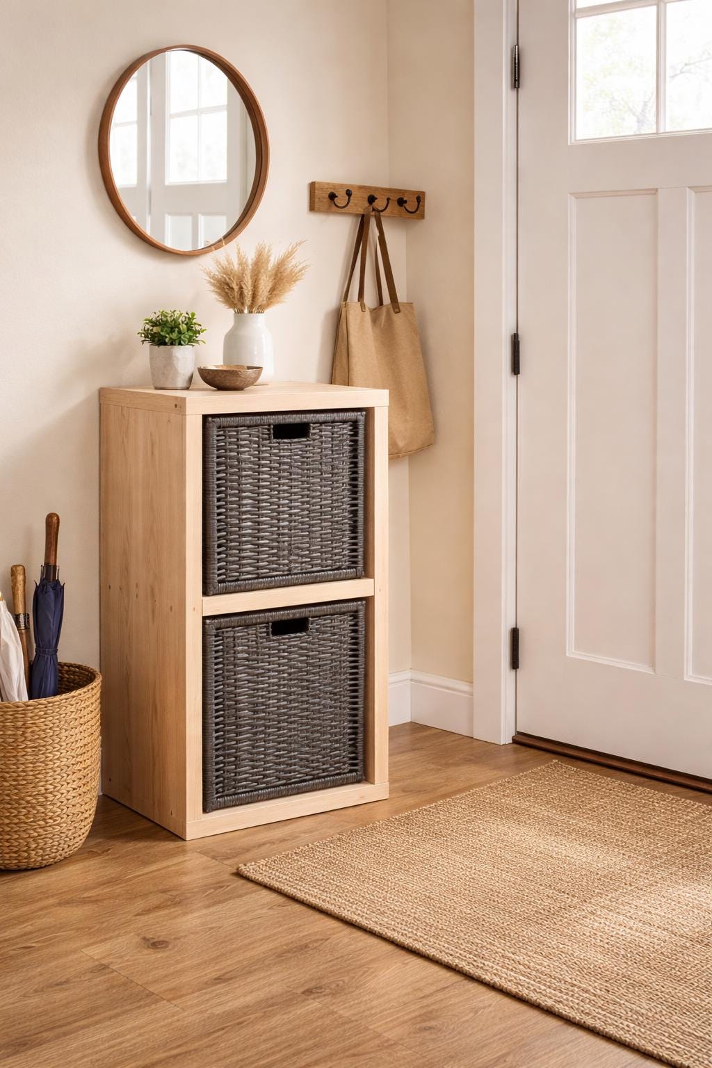 This cabinet blends natural wood with textured woven baskets for a clean, rustic look. It works beautifully in farmhouse, Scandinavian, or modern interiors.